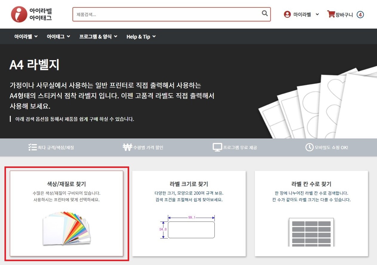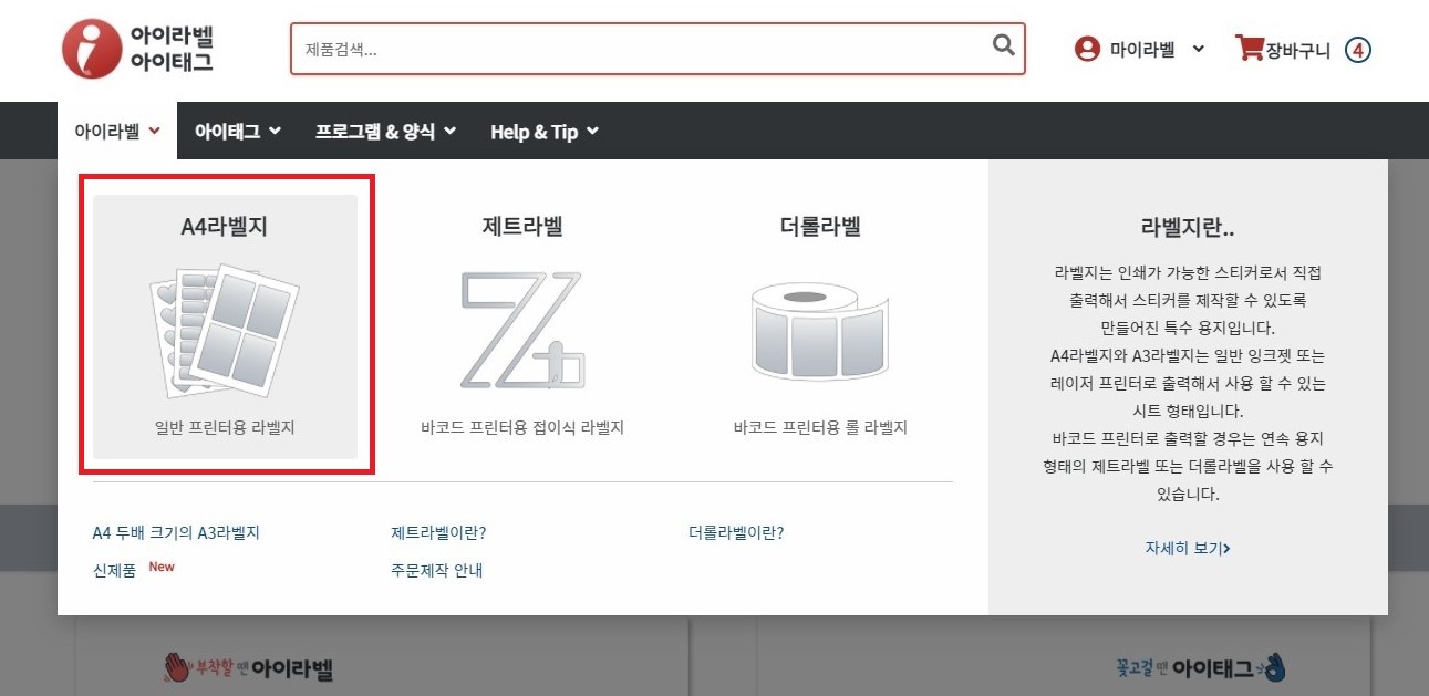 먼저 아이라벨 사이트의 메뉴에서 A4 라벨지를 선택합니다.